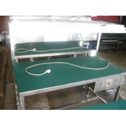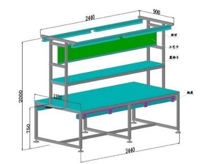 8、长条式工作台:规格L10米×W400,T1.0砂光不锈钢板,内衬15mm木板,双边布置。
